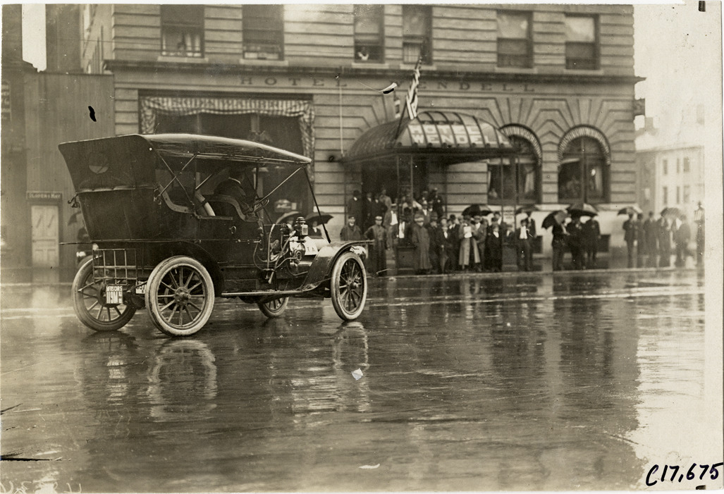 View of Franklin press car parked in front of the Hotel Wendell in Pittsfield, Massachusetts during the 1909 Catskill-Berkshire Tour sponsored by the New York Automobile Trade Association. The tour covered a route through New York, New Jersey, Massachusetts and Connecticut. Stamped on back: "Spooner & Wells, Inc., photographers, telephones 3472-3473 Columbus, 1931 Broadway, New York." Handwritten on back: "#15 Franklin press car checking in in the rain at Pittsfield. Tours--Catskill-Berkshire Tour, 1909."