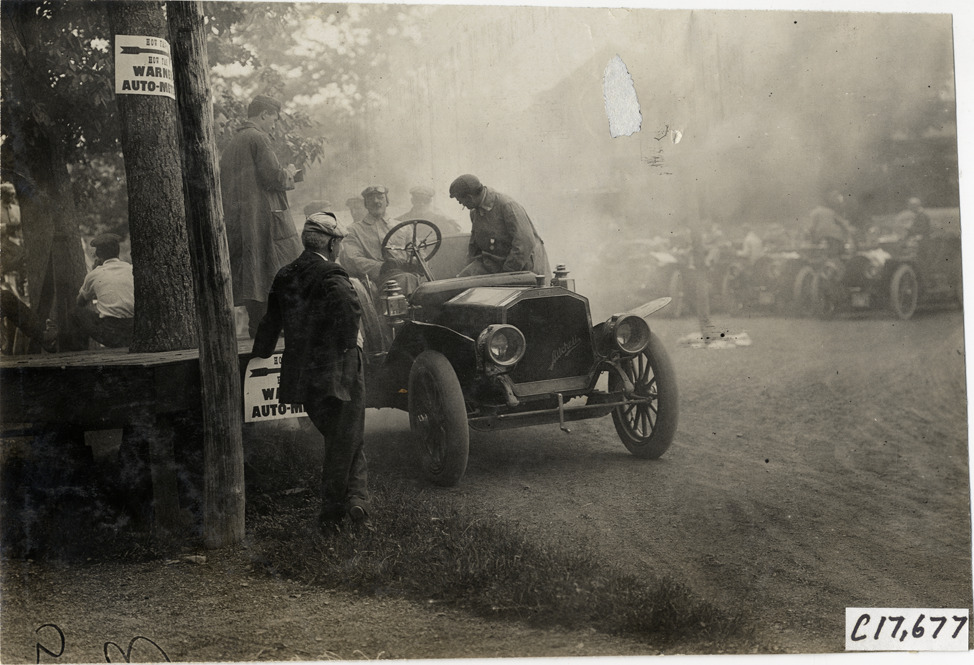 View of O.R. DeLamater and passengers in Mitchell car at Highland Mills, New York during the 1909 Catskill-Berkshire Tour sponsored by the New York Automobile Trade Association. Officials stand next to car The tour covered a route through New York, New Jersey, Massachusetts and Connecticut. Stamped on back: "Spooner & Wells, Inc., photographers, telephones 3472-3473 Columbus, 1931 Broadway, New York." Handwritten on back: "DeLamater in Mitchell checking in at Brunners Lake. Tours--Catskill-Berkshire Tour, 1909."