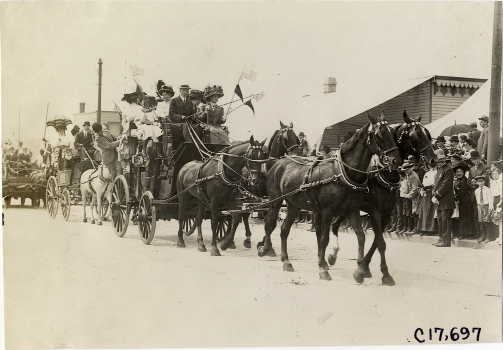Horse-drawn wagons in parade, 1909 Queensboro Bridge Celebration