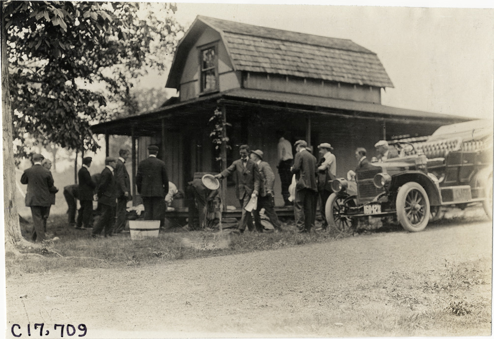 View of motorists with car in front of wooden-frame house at Highland Mills, New York during the 1909 Catskill-Berkshire Tour sponsored by the New York Automobile Trade Association. The tour covered a route through New York, New Jersey, Massachusetts and Connecticut. Stamped on back: "Spooner & Wells, Inc., photographers, telephones 3472-3473 Columbus, 1931 Broadway, New York." Handwritten on back: "Where they used the milk pails to wash in at Brunners Lake. Tours--Catskill-Berkshire Tour, 1909."