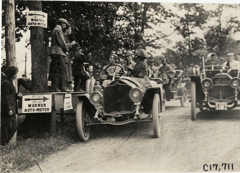 View of W.C. Poertner and passenger in National car at Highland Mills, New York during the 1909 Catskill-Berkshire Tour sponsored by the New York Automobile Trade Association. Oldsmobile car on right; Warner Auto-meter sign displayed on tree. The tour covered a route through New York, New Jersey, Massachusetts and Connecticut. Stamped on back: "Spooner & Wells, Inc., photographers, telephones 3472-3473 Columbus, 1931 Broadway, New York." Handwritten on back: "Poertner in National at Brunners Lake. Tours--Catskill-Berkshire Tour, 1909."