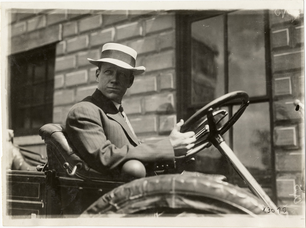 Close-up view of C.T. LaFrance, from Elmira, New York, sitting behind the wheel of an automobile during the 1911 Chalmers factory tour for representatives of the Carl H. Page & Company held in Detroit, Michigan. Handwritten on back: "R. MacDonald, Jamestown, N.Y. Tours--Chalmers salesmen factory tour, 1911."