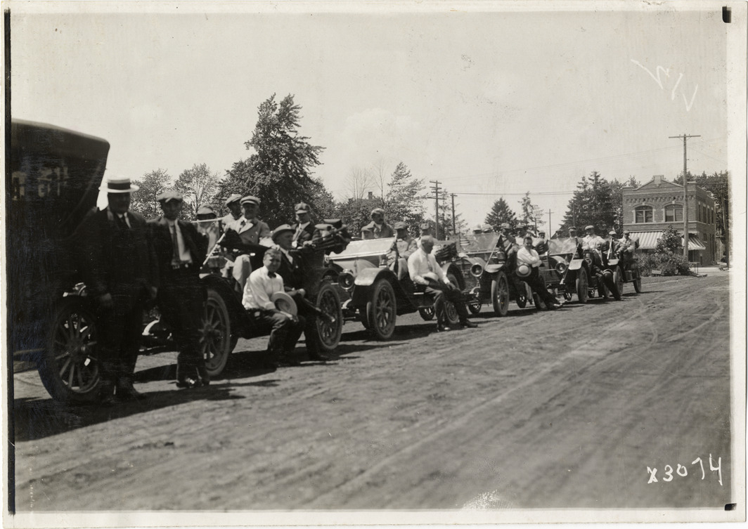 View of men with cars parked in street during the 1911 Chalmers factory tour for representatives of the Carl H. Page & Company held in Detroit, Michigan. Stamped on back: "Spooner & Wells, Inc., photographers, 1231 Woodward Ave., Detroit, Mich., telephone North 1745." Handwritten on back: "Tours--Chalmers salesmen factory tour, 1911."