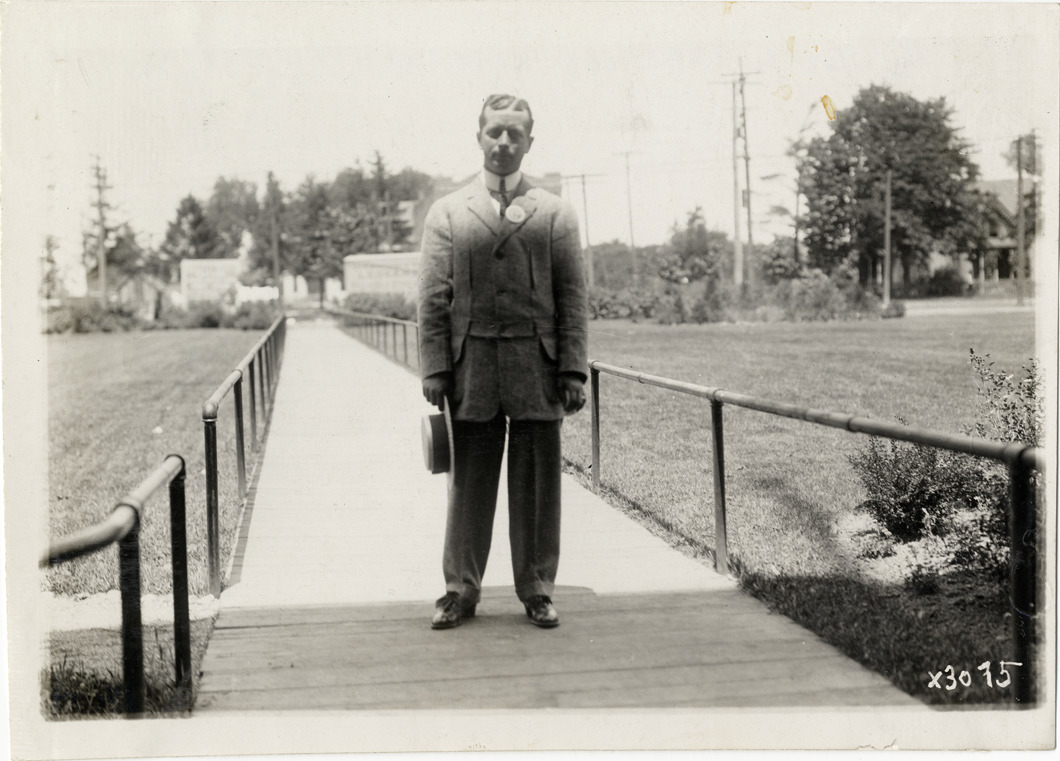 View of J.M. Brik, from Buffalo, New York, posing on sidewalk during the 1911 Chalmers factory tour for representatives of the Carl H. Page & Company held in Detroit, Michigan. Stamped on back: "Spooner & Wells, Inc., photographers, 1231 Woodward Ave., Detroit, Mich., telephone North 1745." Handwritten on back: "J.M. Brik, Buffalo, N.Y. Tours--Chalmers salesmen factory tour, 1911."