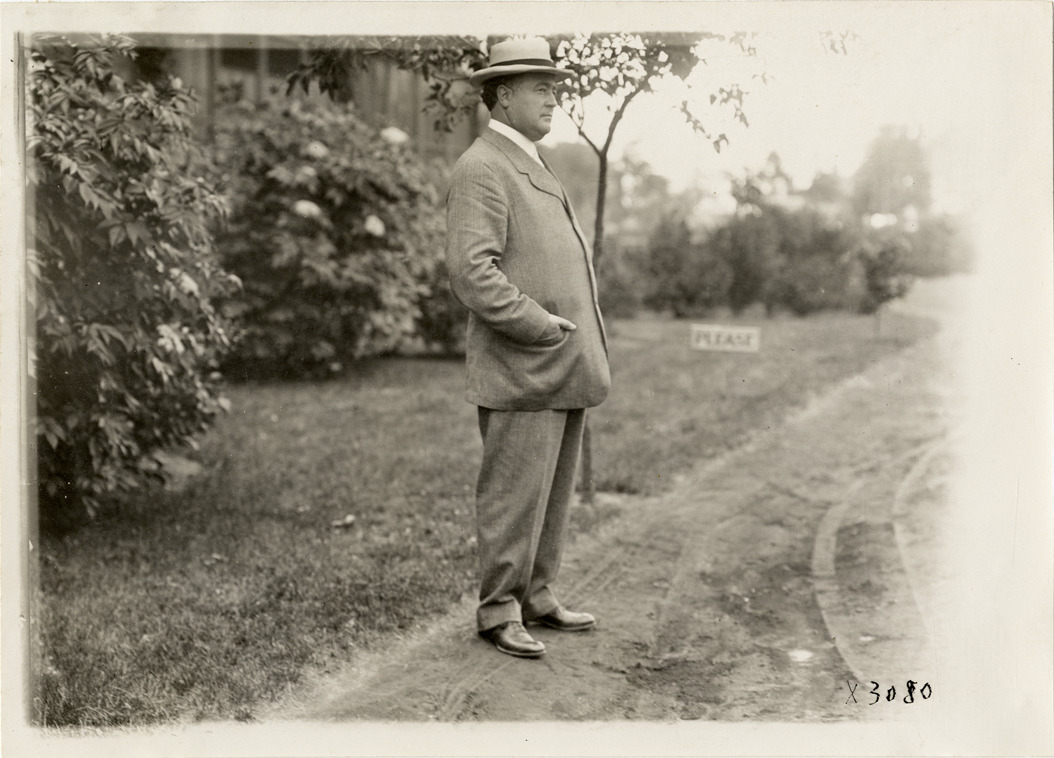 Man posing on lawn, 1911 Chalmers factory tour for Carl H. Page & Company representatives