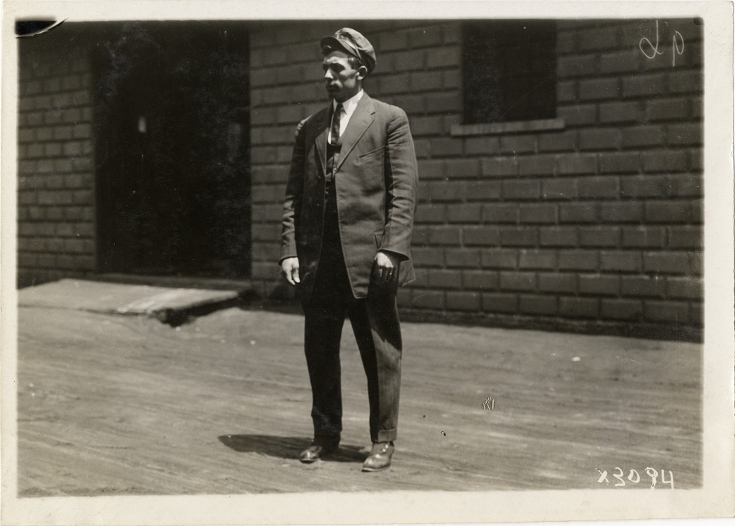 View of R. MacDonald, from Jamestown, New York, during the 1911 Chalmers factory tour for representatives of the Carl H. Page & Company held in Detroit, Michigan. Stamped on back: "Spooner & Wells, Inc., photographers, 1231 Woodward Ave., Detroit, Mich., telephone North 1745." Handwritten on back: "R. MacDonald, Jamestown, N.Y. Tours--Chalmers salesmen factory tour, 1911."