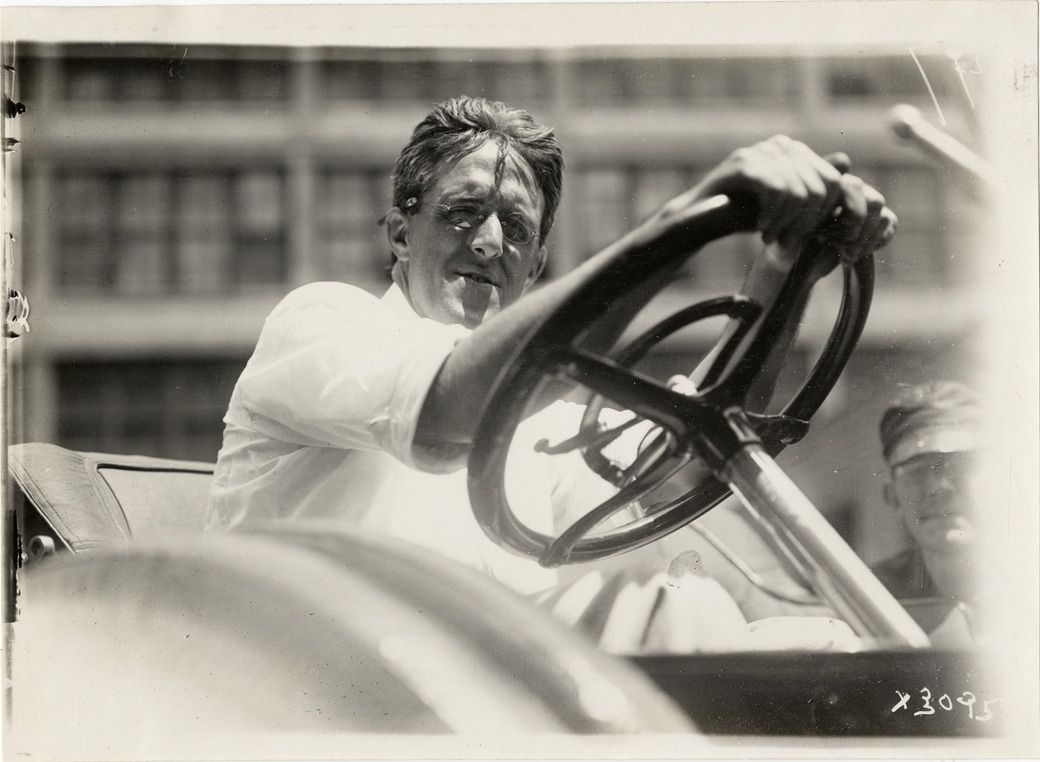 View of Mr. Dunham sitting behind the wheel of an automobile during the 1911 Chalmers factory tour for representatives of the Carl H. Page & Company held in Detroit, Michigan. Handwritten on back: "Mr. Dunham. Tours--Chalmers salesmen factory tour, 1911."