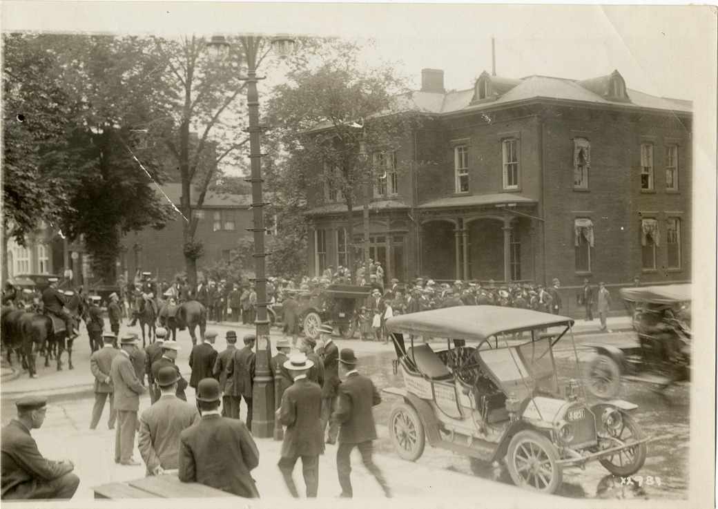 View of men gathered on sidewalks during the 1911 Chalmers factory tour for representatives of the Carl H. Page & Company held in Detroit, Michigan. Car parked in foreground; policemen on horseback in street. Handwritten on back: "M.B. Hatch, Buffalo, N.Y. Tours--Chalmers salesmen factory tour, 1911."