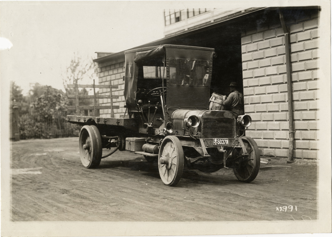 View of truck parked in front of the Chalmers Motor Company factory during the 1911 Chalmers factory tour for representatives of the Carl H. Page & Company held in Detroit, Michigan. Stamped on back: "Spooner & Wells, Inc., photographers, 1231 Woodward Ave., Detroit, Mich., telephone North 1745." Handwritten on back: "Tours--Chalmers salesmen factory tour, 1911."