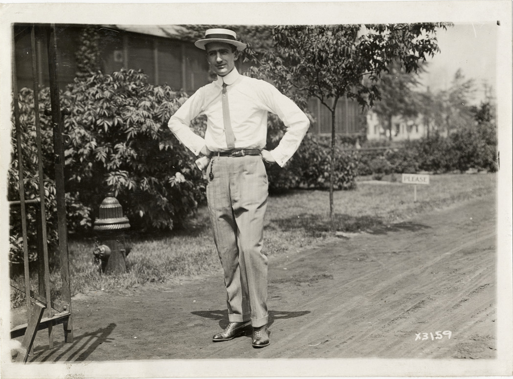 View of E.P. Mander, from New York, New York, posing next to fire hydrant and building during the 1911 Chalmers factory tour for representatives of the Carl H. Page & Company held in Detroit, Michigan. Stamped on back: "Spooner & Wells, Inc., photographers, 1231 Woodward Ave., Detroit, Mich., telephone North 1745." Handwritten on back: "E.P. Mander, New York. Tours--Chalmers salesmen factory tour, 1911."