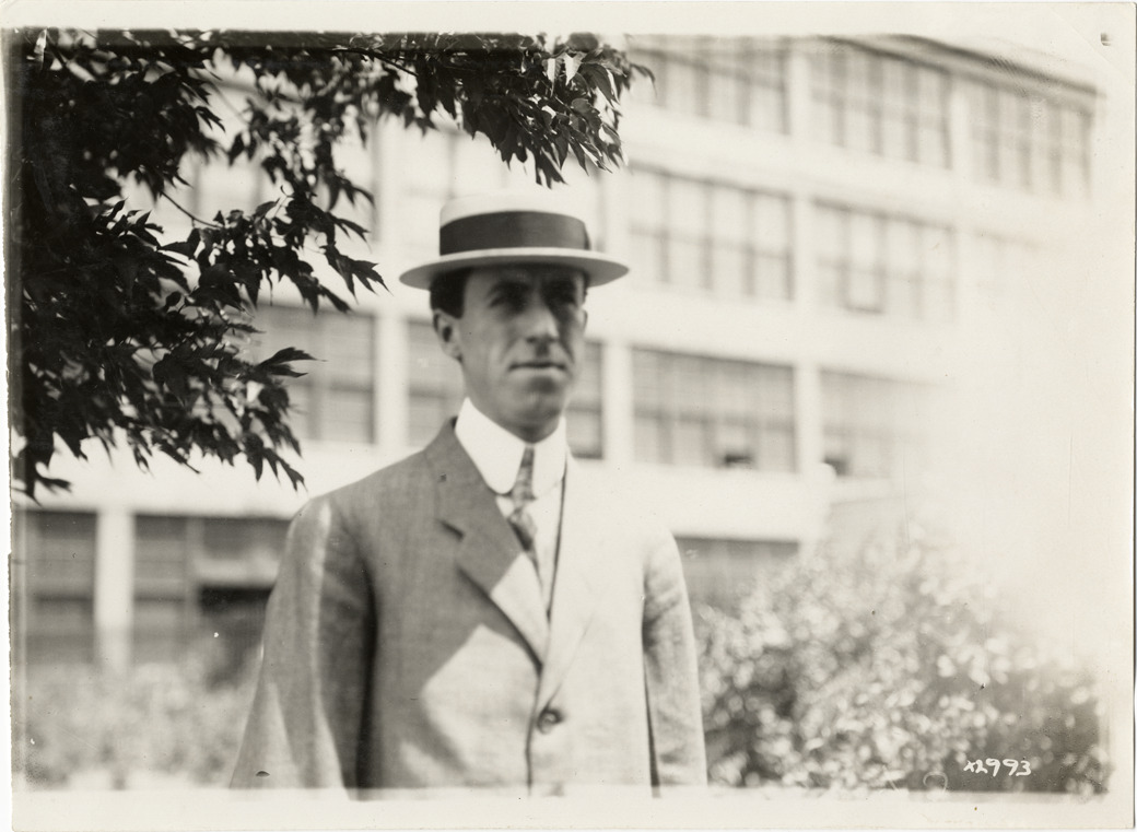 Close-up view of man posing in front of factory during the 1911 Chalmers factory tour for representatives of the Carl H. Page & Company held in Detroit, Michigan. Handwritten on back: "Tours--Chalmers salesmen factory tour, 1911."