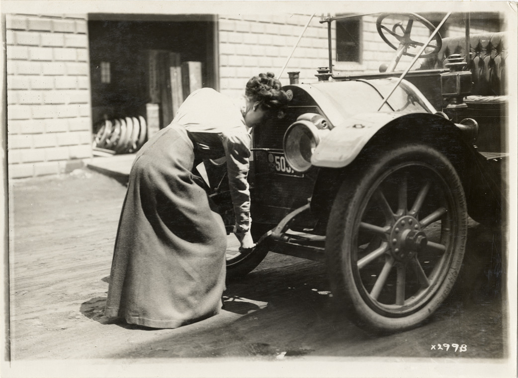 View of Irene Wright starting a Chalmers car during the 1911 Chalmers factory tour for representatives of the Carl H. Page & Company held in Detroit, Michigan. Handwritten on back: "Miss Irene Wright. Tours--Chalmers salesmen factory tour, 1911."