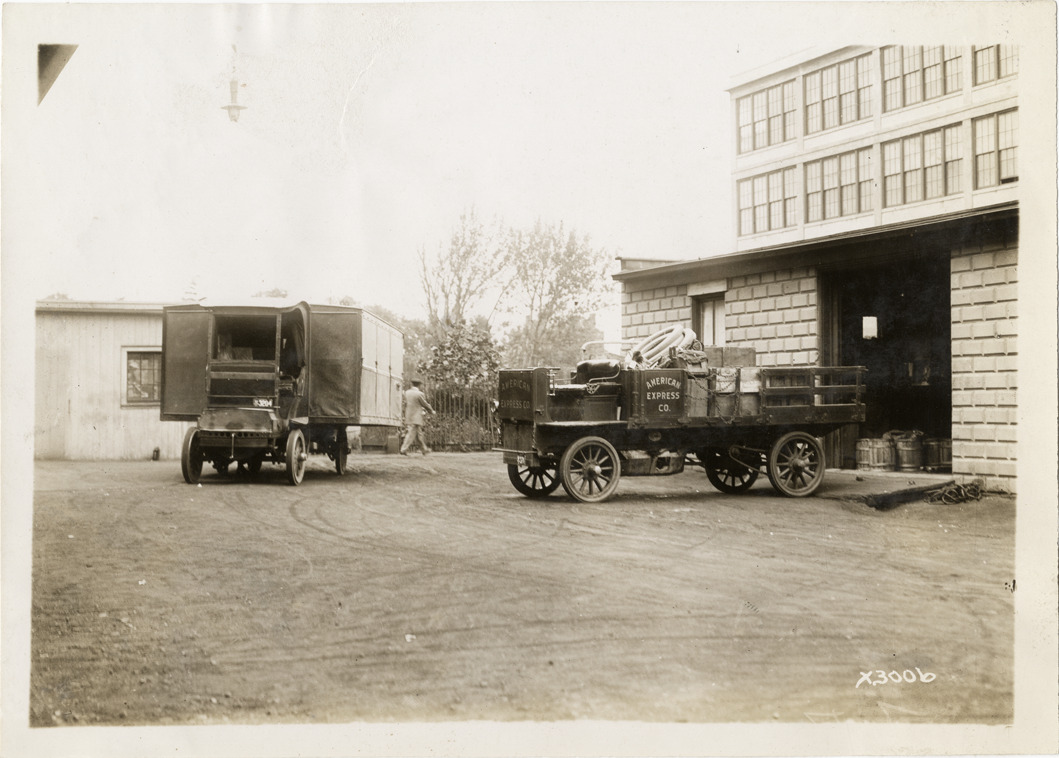 View of two trucks parked at factory during the 1911 Chalmers factory tour for representatives of the Carl H. Page & Company held in Detroit, Michigan. American Express Company truck is parked in front of open garage door. Handwritten on back: "Tours--Chalmers salesmen factory tour, 1911."