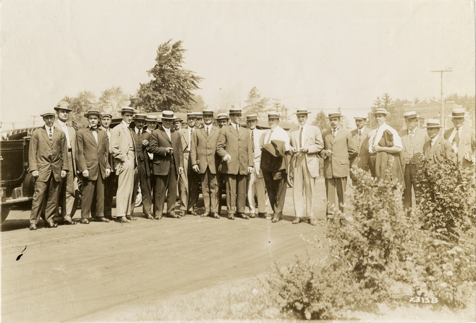 View of men, wearing straw boaters and suits, posing in road during the 1911 Chalmers factory tour for representatives of the Carl H. Page & Company held in Detroit, Michigan. Stamped on back: "Spooner & Wells, Inc., photographers, 1231 Woodward Ave., Detroit, Mich., telephone North 1745." Handwritten on back: "Tours--Chalmers salesmen factory tour, 1911."