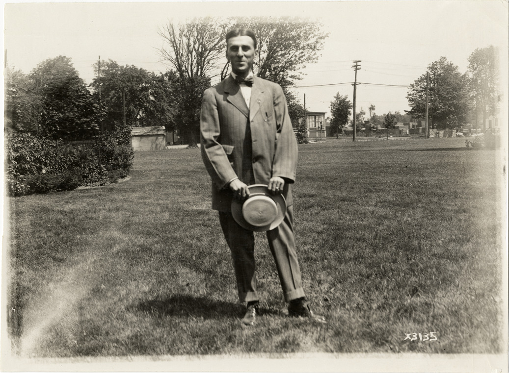 View of G.C. Keck, from Mt. Vernon, New York, during the 1911 Chalmers factory tour for representatives of the Carl H. Page & Company held in Detroit, Michigan. Handwritten on back: "G.C. Keck, Mt. Vernon, N.Y. Tours--Chalmers salesmen factory tour, 1911."