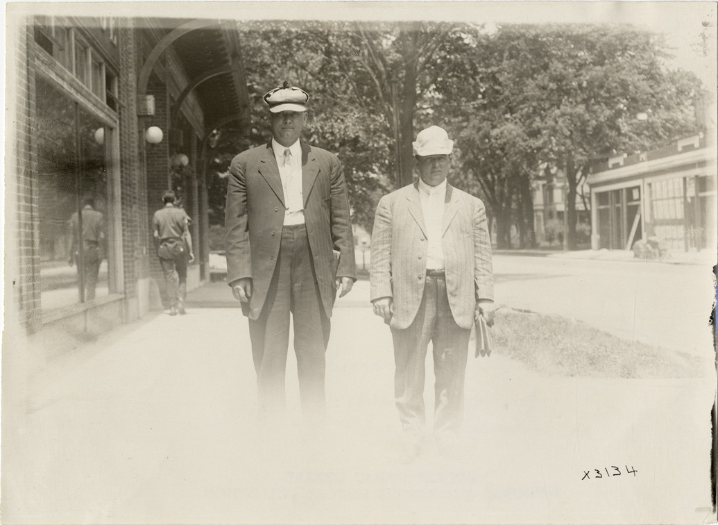 View of C.S. Wickard and F.J. Weisenmiller, from Cumberland, Maryland, during the 1911 Chalmers factory tour for representatives of the Carl H. Page & Company held in Detroit, Michigan. Handwritten on back: "C.S. Wickard, F.J. Weisenmiller, Cumberland, Md. Tours--Chalmers salesmen factory tour, 1911."