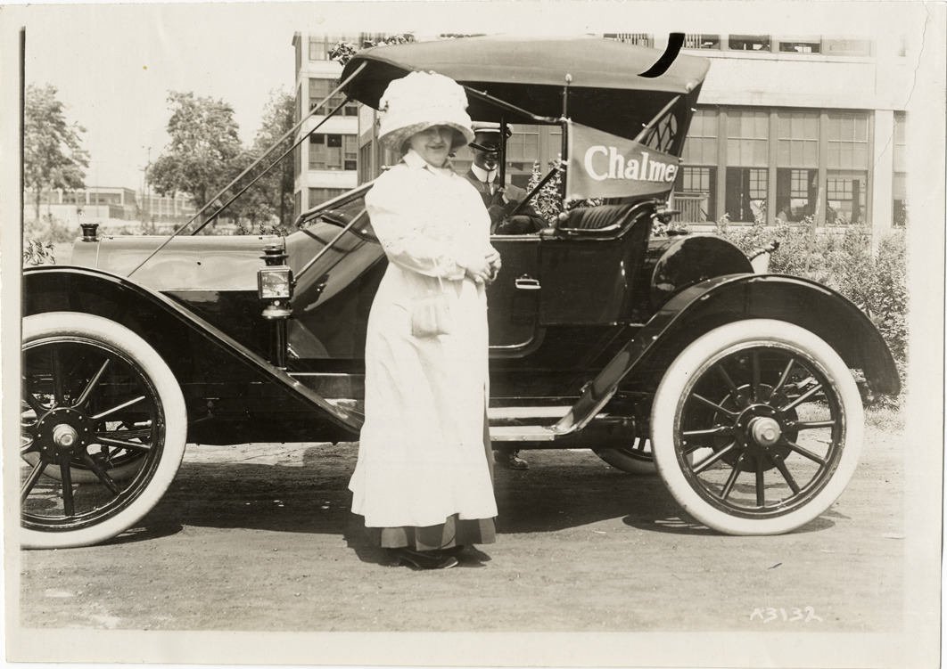 Woman with Chalmers automobile, 1911 Chalmers factory tour for Carl H. Page & Company representatives