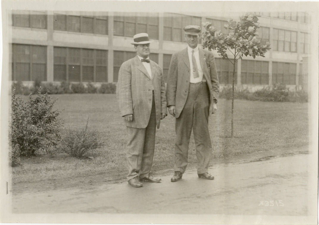 View of R.L. Graham and C.W. Counseller, from Lima, Ohio, during the 1911 Chalmers factory tour for representatives of the Carl H. Page & Company held in Detroit, Michigan. Handwritten on back: "R.L. Graham, C.W. Counsellor, Lima, Ohio. Tours--Chalmers salesmen factory tour, 1911."