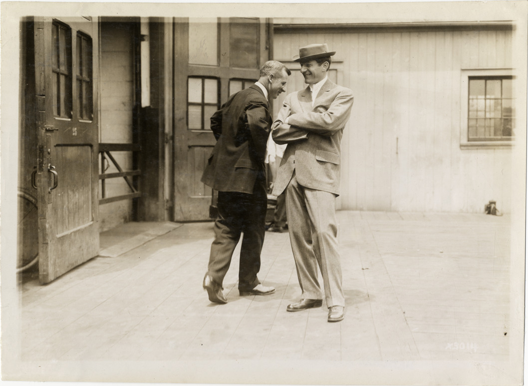 View of two men standing next to building during the 1911 Chalmers factory tour for representatives of the Carl H. Page & Company held in Detroit, Michigan. Stamped on back: "Spooner & Wells, Inc., photographers, 1231 Woodward Ave., Detroit, Mich., telephone North 1745." Handwritten on back: "Tours--Chalmers salesmen factory tour, 1911."