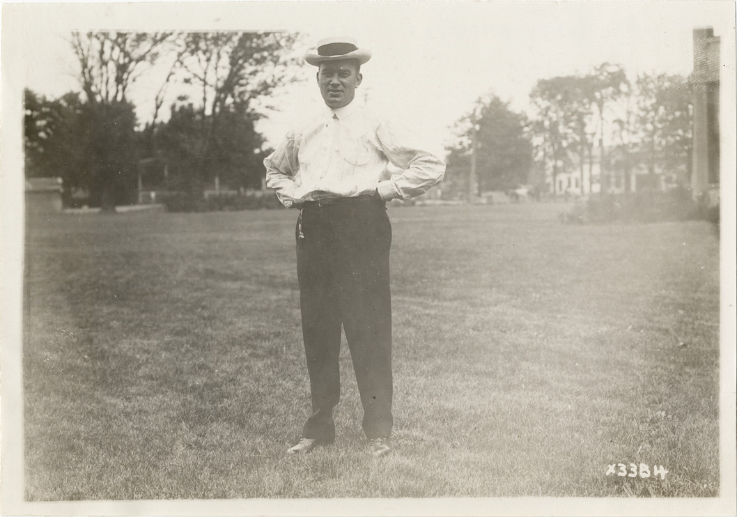 View of J.E. Fields, from Fargo, South Dakota, during the 1911 Chalmers factory tour for representatives of the Carl H. Page & Company held in Detroit, Michigan. Handwritten on back: "J.E. Fields, Fargo, S.D. Tours--Chalmers salesmen factory tour, 1911."