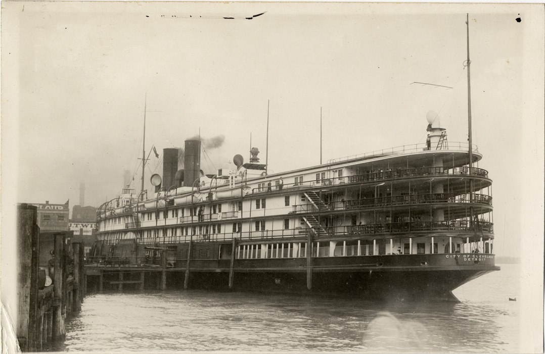 View of the ferry "City of Cleveland" adjacent to dock during the 1911 Chalmers factory tour for representatives of the Carl H. Page & Company held in Detroit, Michigan. Handwritten on back: "Tours--Chalmers salesmen factory tour, 1911."