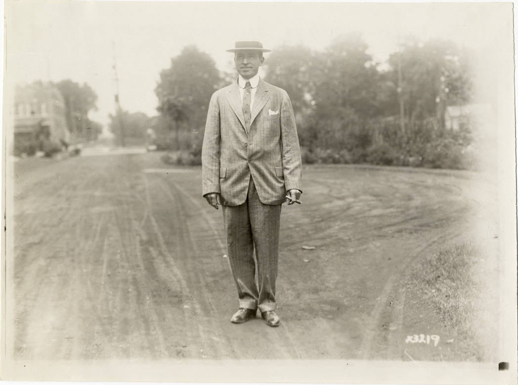 View of Charles Chalmers, from Philadelphia, Pennsylvania, during the 1911 Chalmers factory tour for representatives of the Carl H. Page & Company held in Detroit, Michigan. Handwritten on back: "Charles Chalmers, Philadelphia, Pa. Tours--Chalmers salesmen factory tour, 1911."