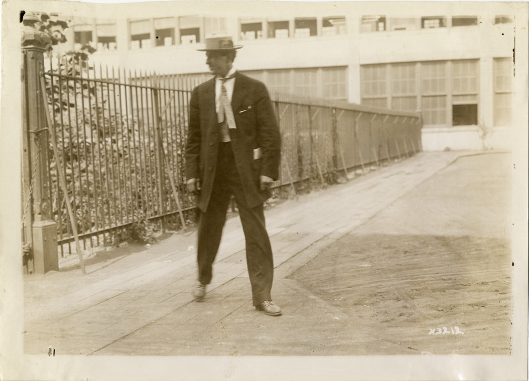 View of Mr. Quimby, from Menominee, Michigan, during the 1911 Chalmers factory tour for representatives of the Carl H. Page & Company held in Detroit, Michigan. Factory and fence in background. Handwritten on back: "Mr. Quimby, Menominee, Mi. Tours--Chalmers salesmen factory tour, 1911."