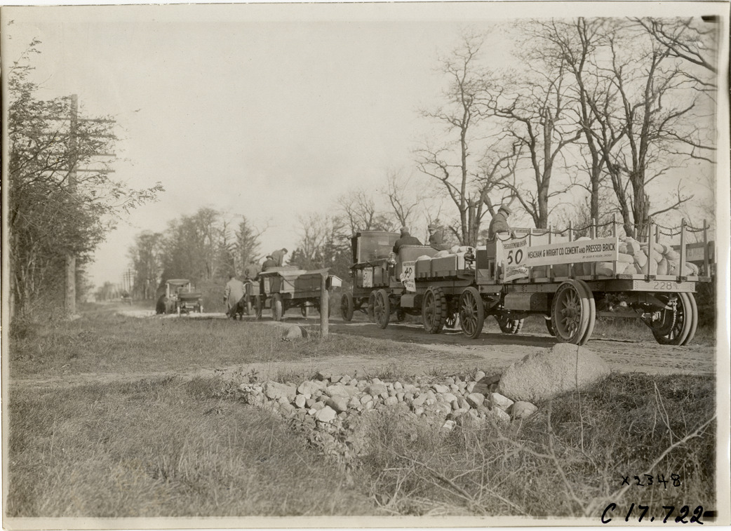 View of trucks lined up on rural road during the 1910 Chicago Motor Truck Run. Participants traveled a route from Chicago, Illinois to Milwaukee, Wisconsin and return. Stamped on back: "Spooner & Wells, Inc., photographers, telephone North 1745. 1231 Woodward Ave., Detroit, Mich. Detroit, 1231 Woodward, New York, 1931 Broadway." Handwritten on back: "Tours--Chicago Motor Truck Run, 1910."