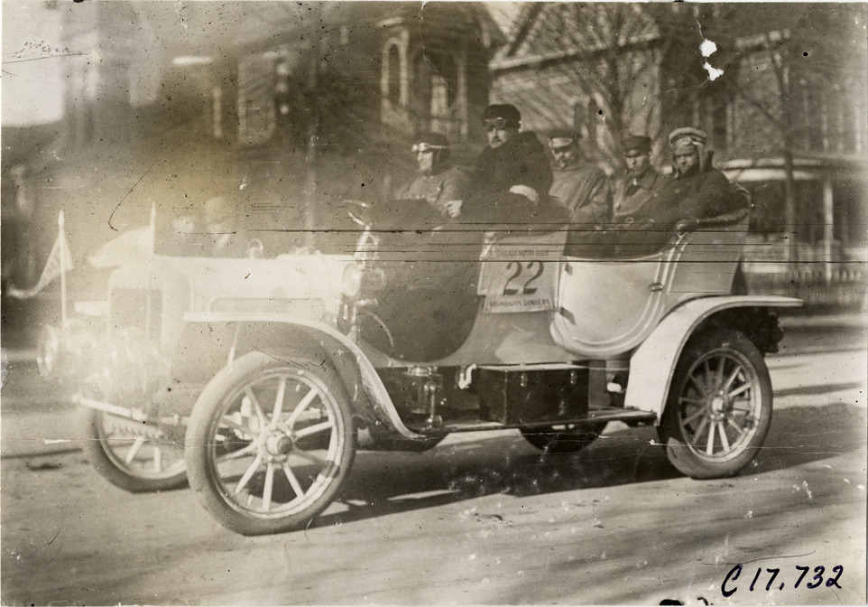 View of driver and passengers in car no. 22 during 1907 Reliability Contest sponsored by the Chicago Motor Club. Participants traveled routes through Illinois and Indiana. Handwritten on back: "Tours--Chicago Reliability Run, 1907."