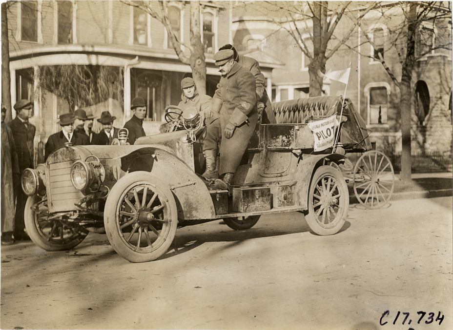 View of Edward E. Guston and S.E. Comstock in Rambler pilot car during 1907 Reliability Contest sponsored by the Chicago Motor Club. Confetti was to be strewn from this car. Participants traveled routes through Illinois and Indiana. Stamped on back: "Spooner and Wells, 1931 Broadway, New York, duplicates any time, enlargements all sizes, tel. 3472-3473 Col., credit appreciated." Handwritten on back: "Rambler pilot & confetti car, S.E. Comstock and E.E. Guston. Tours--Chicago Reliability Run, 1907."