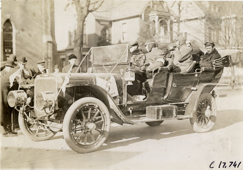 View of Clinton Clark and passengers in Stevens-Duryea car no. 8 during 1907 Reliability Contest sponsored by the Chicago Motor Club. Participants traveled routes through Illinois and Indiana. Stamped on back: "Spooner and Wells, 1931 Broadway, New York, duplicates any time, enlargements all sizes, tel. 3472-3473 Col., credit appreciated." Handwritten on back: "Stevens-Duryea, Clinton Clark. Tours--Chicago Reliability Run, 1907."