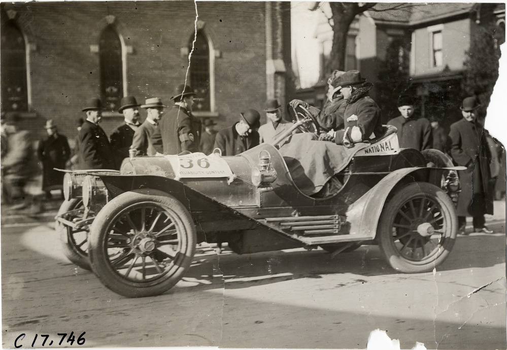 View of driver and passengers in National car no. 36 during 1907 Reliability Contest sponsored by the Chicago Motor Club. Participants traveled routes through Illinois and Indiana. Handwritten on back: "Tours--Chicago Reliability Run, 1907."