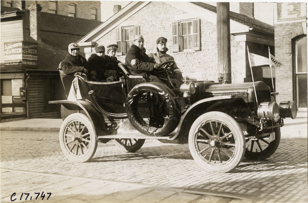 View of driver and passengers in White Steamer car during 1907 Reliability Contest sponsored by the Chicago Motor Club. Commercial buildings in background. Participants traveled routes through Illinois and Indiana. Handwritten on back: "Tours--Chicago Reliability Run, 1907."