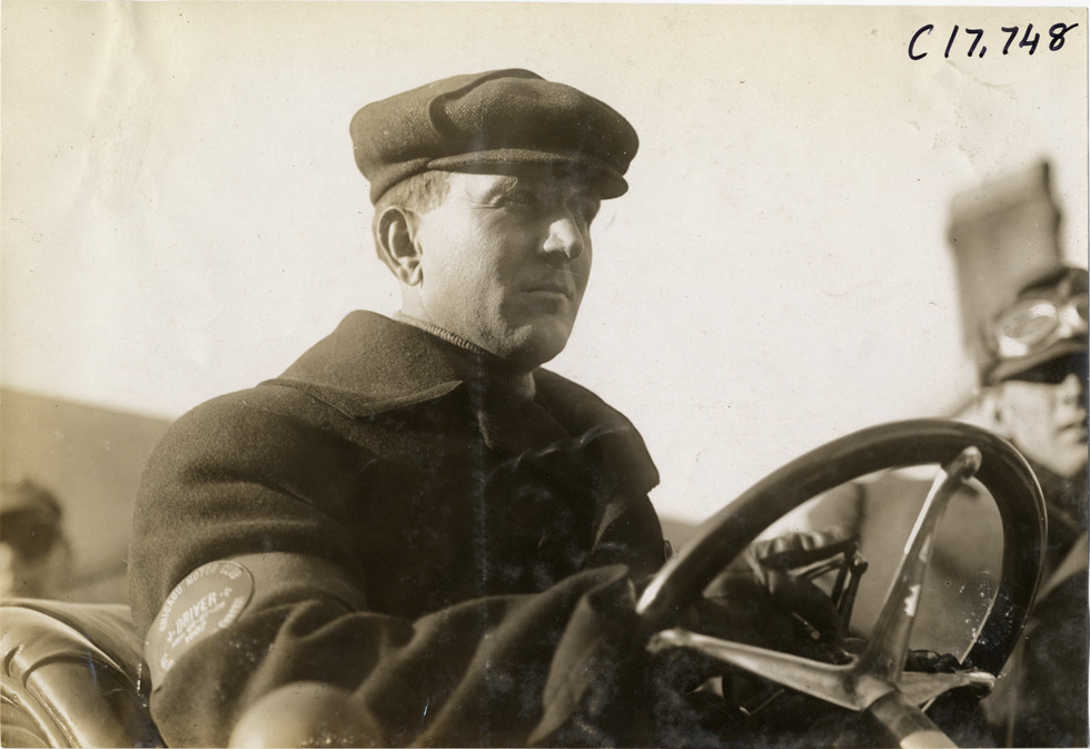 Close-up view of driver in car during 1907 Reliability Contest sponsored by the Chicago Motor Club. Man wears cap and "Chicago Motor Club, driver, 1907" patch on sleeve. Participants traveled routes through Illinois and Indiana. Handwritten on back: "Tours--Chicago Reliability Run, 1907."