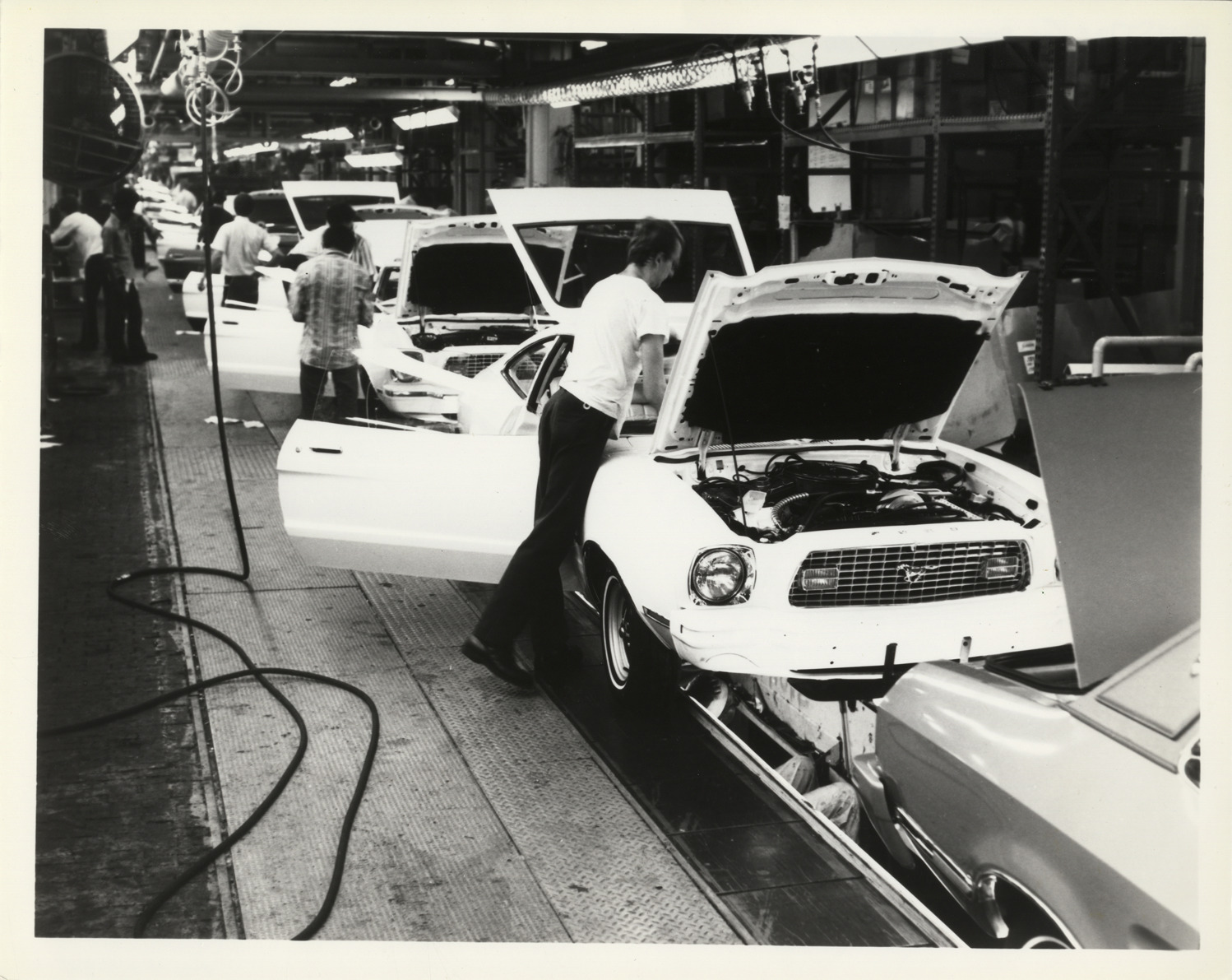 Favorite this☆ Men working on Mustang at Ford Motor Company plant assembly line Description: View of men working on Mustang at Ford Motor Company plant assembly line. Handwritten on back: "Mustang." Details Resource ID: na020004 Subject: Mustang automobile Automobile industry workers--Michigan--Dearborn Automobile factories--Michigan--Dearborn Ford Motor Company Photographic prints Date Issued: Unknown year Format: 1 photographic print ; 8 x 10 in. Member of: National Automotive History Collection Filing Location: Factories-Ford Rights: Physical rights are retained by DPL. Copyright is retained in accordance with U.S. copyright laws.