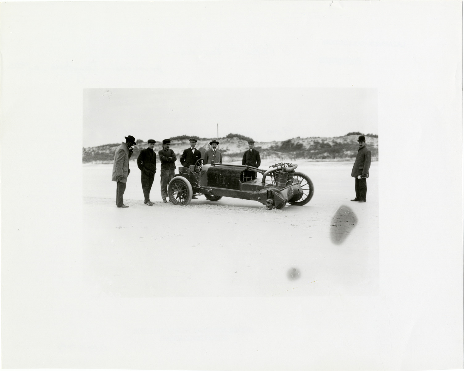 View of several men standing around Christie car no. 14, built and driven by Walter Christie, during the 1905 Ormond-Daytona races in Florida. Handwritten on back: "Races and racing--Ormond-Daytona (Misc. activities), 1905."