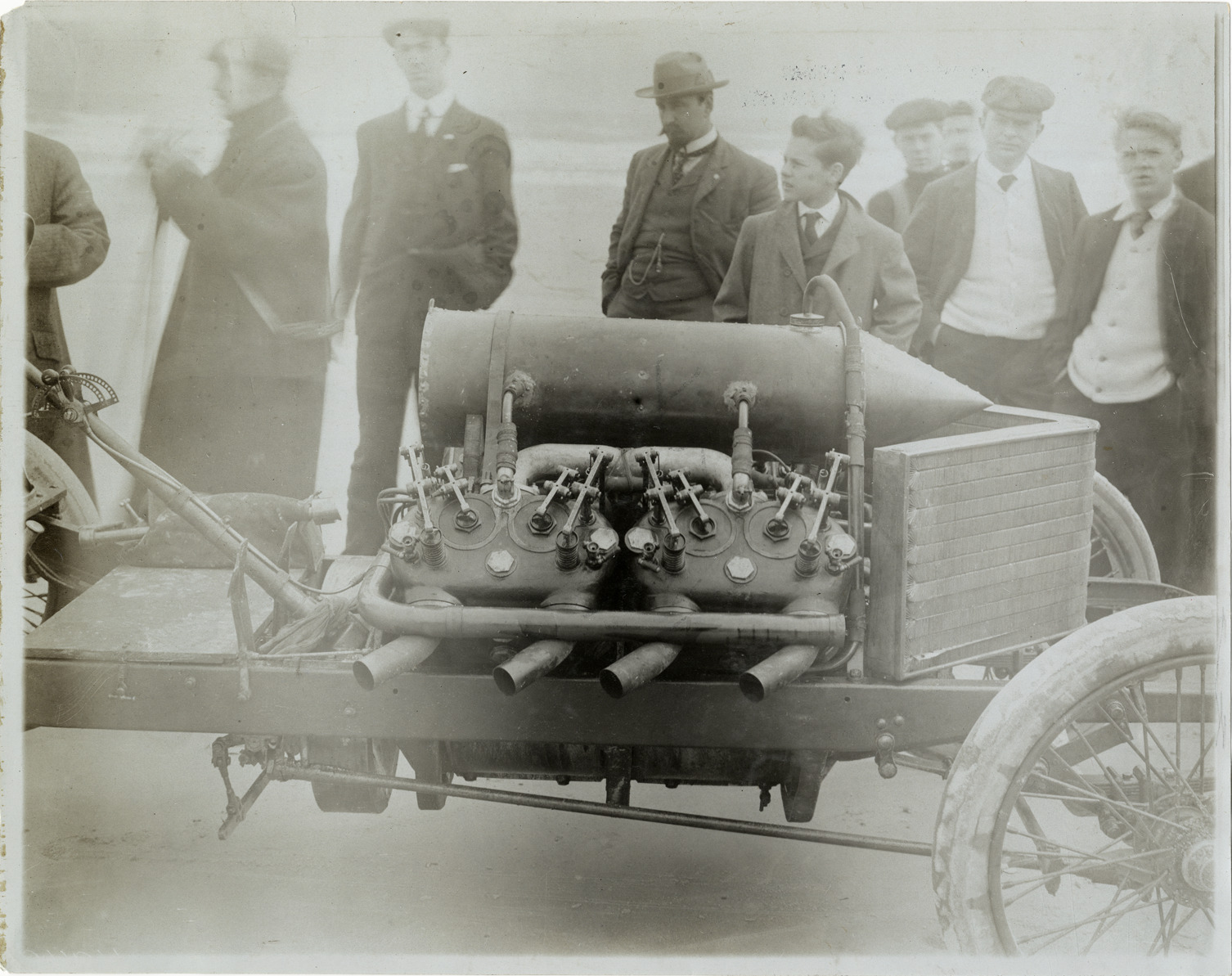 View of men standing behind Darracq car, showing close-up of engine, during the 1906 Ormond-Daytona races in Florida. Stamped on back: "Photo by F. Ed. Spooner, 1536 B'way, telephone 6536-38th St., New York, N.Y." Handwritten on back: "Other side, Hemery, engine 200 h.p. Darracq. Races and racing--Ormond-Daytona, 1906."