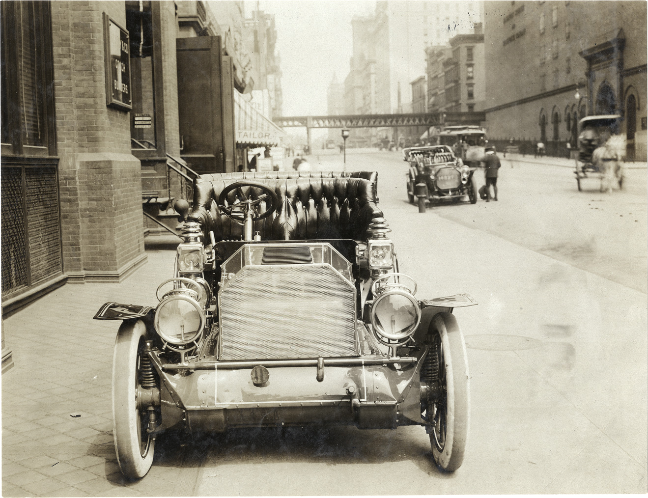 Front view of 1907 Christie car, parked on street. Handwritten on back: "Christie, 1907."