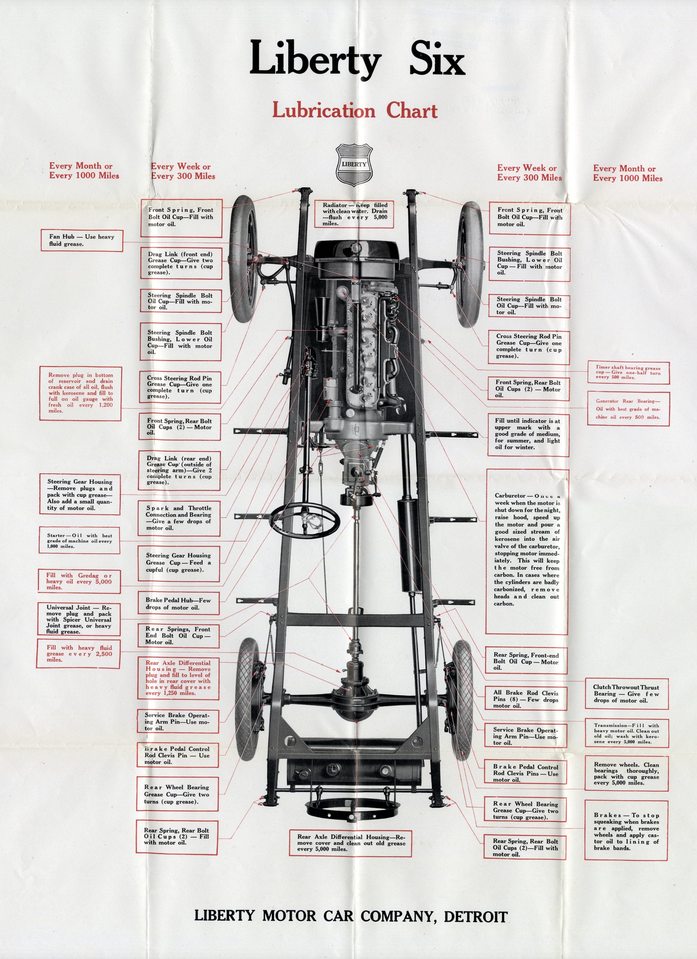 Lubrication chart with captions for 1923 Liberty Six car. Printed on front: "Liberty Six, lubrication chart, Liberty Motor Car Company, Detroit."