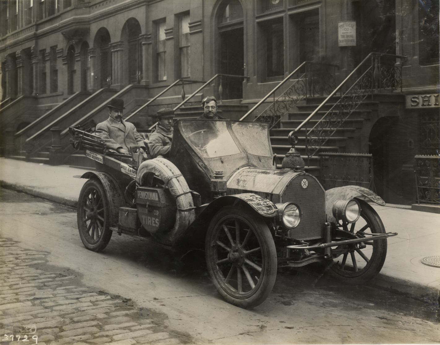 View of three men posing in 1910 Abbott-Detroit "Bull Dog" car on street. "100,000 mile durability run, Abbott-Detroit Bull Dog" painted on car. Advertisement for Pennsylvania vacuum cup tires on side of car. Stamped on back: "Spooner & Wells, Inc., photographers, telephones 3472-3473 Columbus, 1931 Broadway, New York." Handwritten on back: "Abbott-Detroit, 1910."