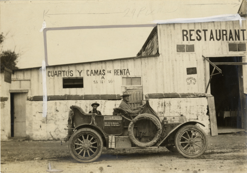 View of driver posing in 1910 Abbott-Detroit "Bull Dog" car in front of restaurant in Sanchez, Mexico. "100,000 mile durability run, Abbott-Detroit Bull Dog, Kas. City to Denver, Denver to Detroit" painted on car. Painted on building: "Restaurant, cuartos y camas de renta, 25, 15Y, 50 [restaurant, rooms and beds for rent for 25, 15 and 50 cents]." Typed on back: "In front of the leading hotel Sanchez, Mexico. Handwritten on back: "Abbott-Detroit, 1910."