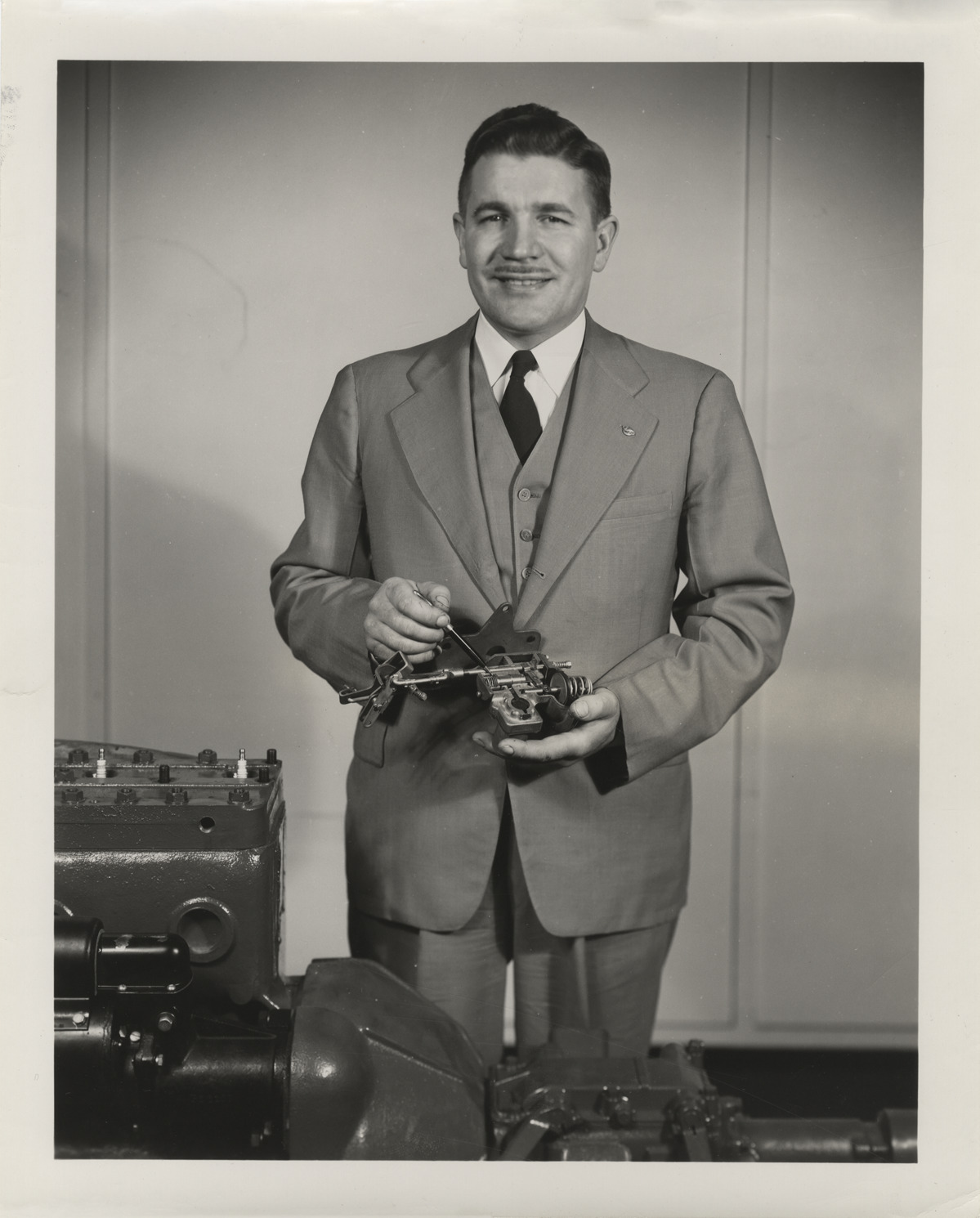 Favorite this☆ Michael Kollins Description: Portrait of Michael Kollins, holding an automobile part. Handwritten on back: "M.J. Kollins, 1948." Details Resource ID: na020052 Subject: Kollins, Michael J. Automobile engineers Photographic prints Date Issued: 1948 Format: 1 photographic print ; 10 x 8 in. Member of: National Automotive History Collection Filing Location: Biography-Kollins, M.J. Rights: Physical rights are retained by DPL. Copyright is retained in accordance with U.S. copyright laws.