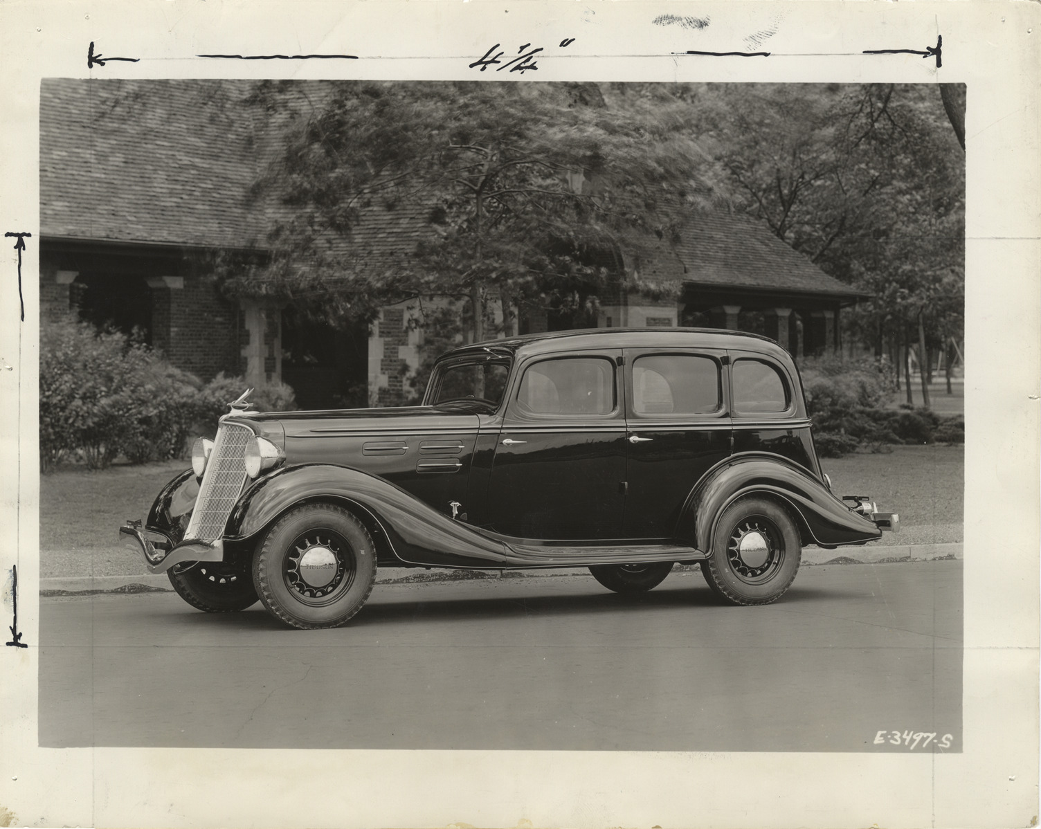 View of 1934 Hudson Challenger sedan. Car is parked in front of brick and stone building. Typed on back: "1934 Hudson. New Challenger sedan which carries the lowest price ever quoted on a Hudson car." Handwritten on back: "Hudson Challenger, $765 sedan."