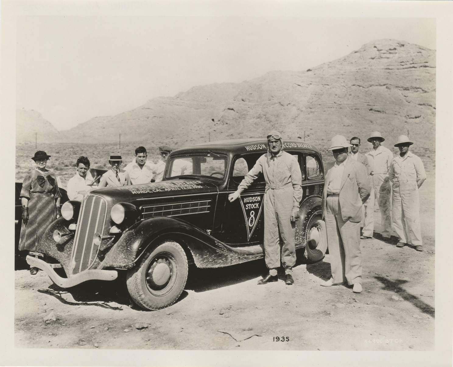 View of driver posing with 1935 Hudson Stock 8 car. Painted on car: "Hudson Stock 8; Hudson A.A.A. record breaker; 36 stock car records, Muroc, Cal. April 12, 13, 1935." Woman and several men, some wearing pith helmets, stand around car. Handwritten on back: "Hudson, 1935. Special Eight."
