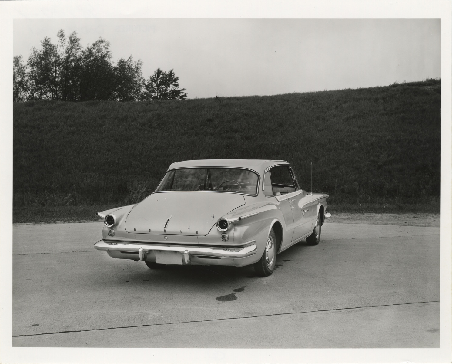 Rear view of 1961 Dodge Lancer 770 coupe. Handwritten on back: "Dodge, 1961, Lancer 770."