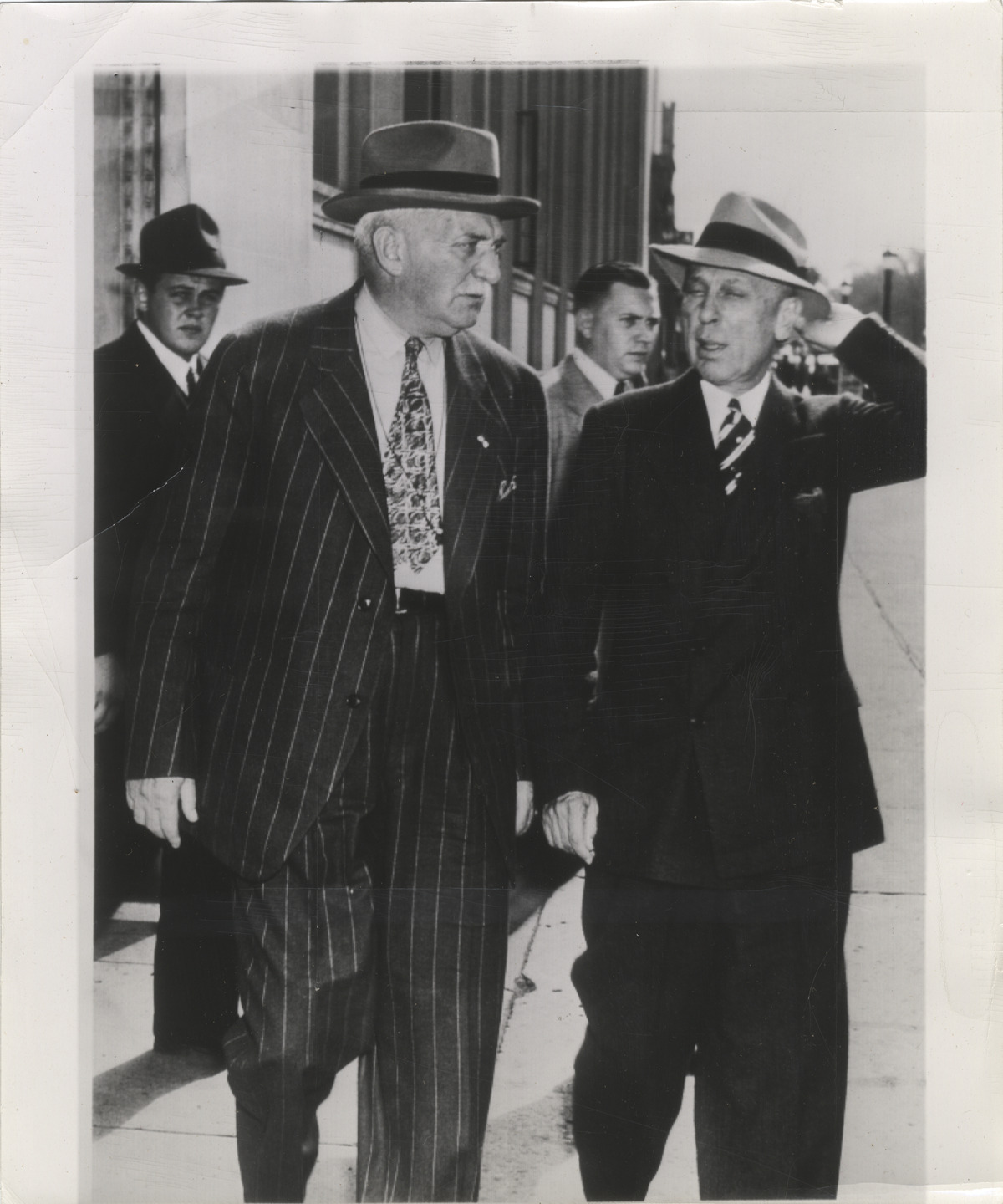 View of William S. Knudsen, president of General Motors, and Alfred P. Sloan, Jr., chairman of the board, walking to court to attend an antitrust trial in South Bend, Indiana. Label on back: "Today's pictures today. Motor generals of General Motors Corporation are gathered in South Bend, Ind., to attend an antitrust trial being conducted in the federal court. The trial is a legal test of sales finance methods allegedly used by the auto manufacturers. Shown here on their way to court are William S. Knudsen, president of General Motors, and Alfred P. Sloan, Jr., chairman of the board." Typed on back: "William S. Knudsen."