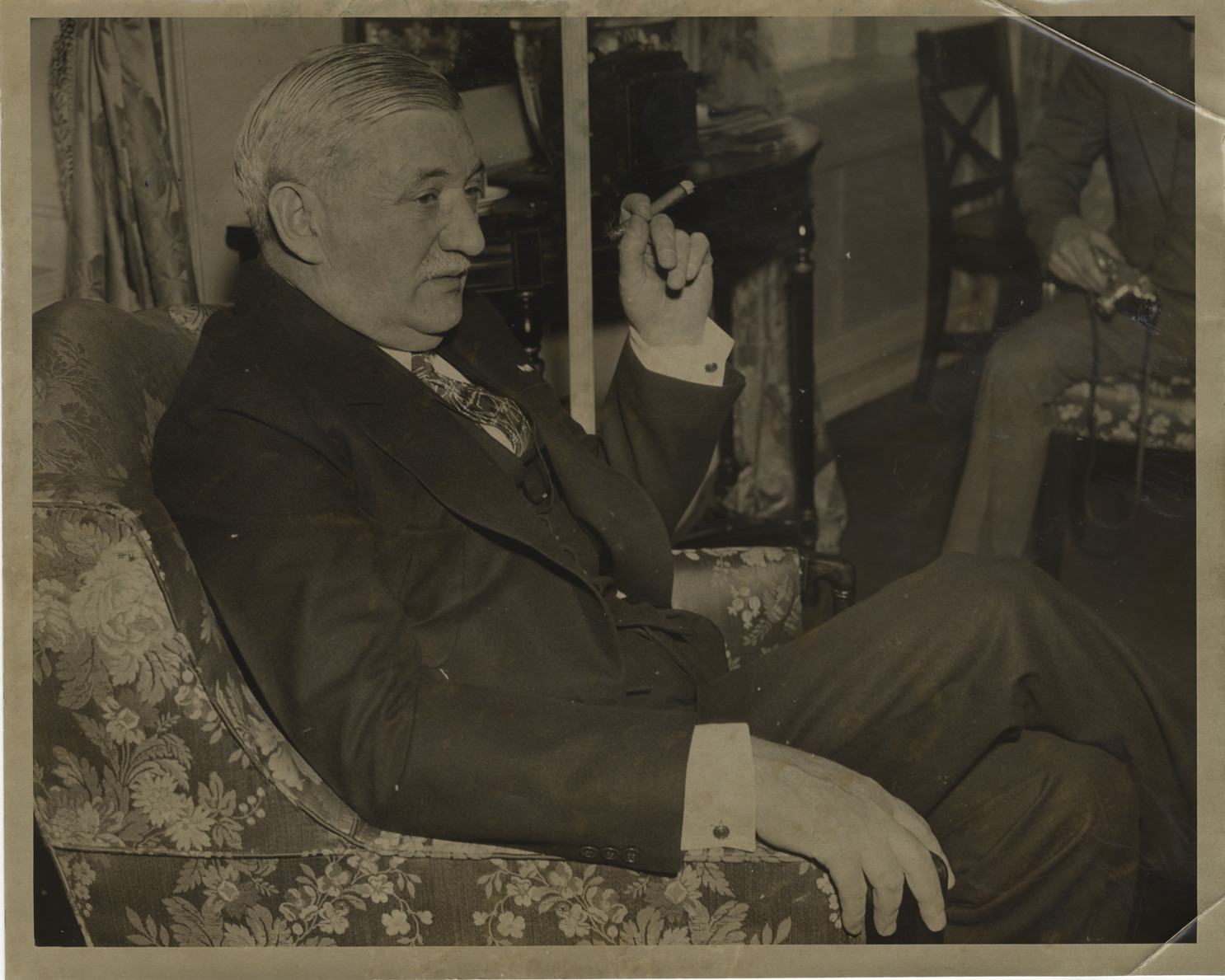 Favorite this☆ William S. Knudsen Description: View of William S. Knudsen, sitting in an armchair and smoking a cigar. Handwritten on back: "Wm. S. Knudsen." Details Resource ID: na020095 Subject: Knudsen, William S., 1879-1948 Automobile industry executives Photographic prints Date Issued: Unknown year Format: 1 photographic print ; 8 x 10 in. Member of: National Automotive History Collection Filing Location: Biography--Knudsen, William S. Rights: Physical rights are retained by DPL. Copyright is retained in accordance with U.S. copyright laws.