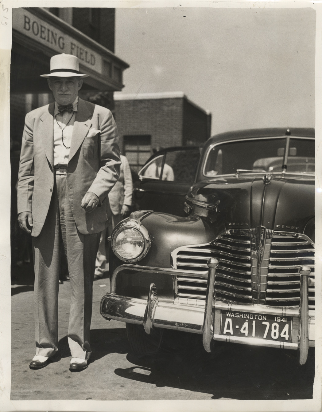 View of William S. Knudsen posing next to a Buick Eight car in Seattle. Label on back: "Big Bill Knudsen, director-general of the Office of Production Management, was a recent Seattle visitor. While here a big Buick was put at his disposal by M.O. Anderson for the inspection of various local plants engaged in national defense."