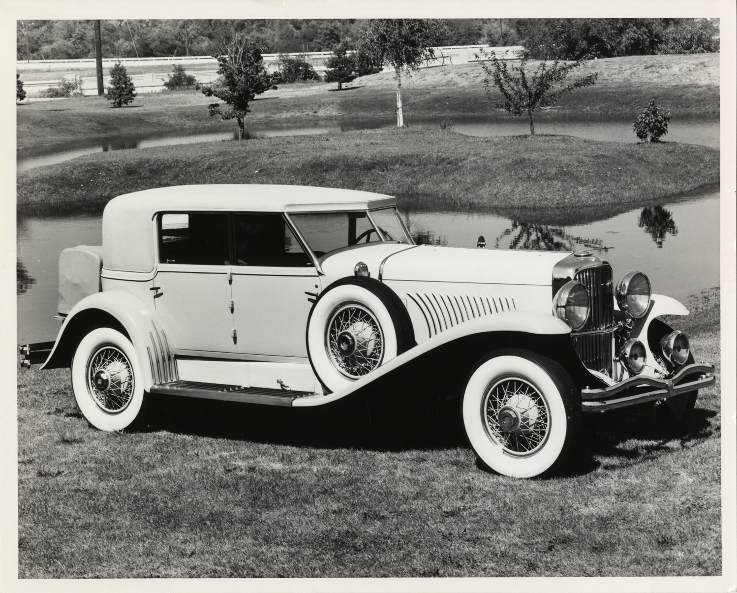 View of 1929 Duesenberg Model J-139 Sport Sedan by the Walter M. Murphy Co. Stamped on back: "Gene Zimmerman's Automobilorama 'History on Wheels', Box 1855, Harrisburg, Pa." Handwritten on back: "J139 Murphy Sport Sedan, 1929."