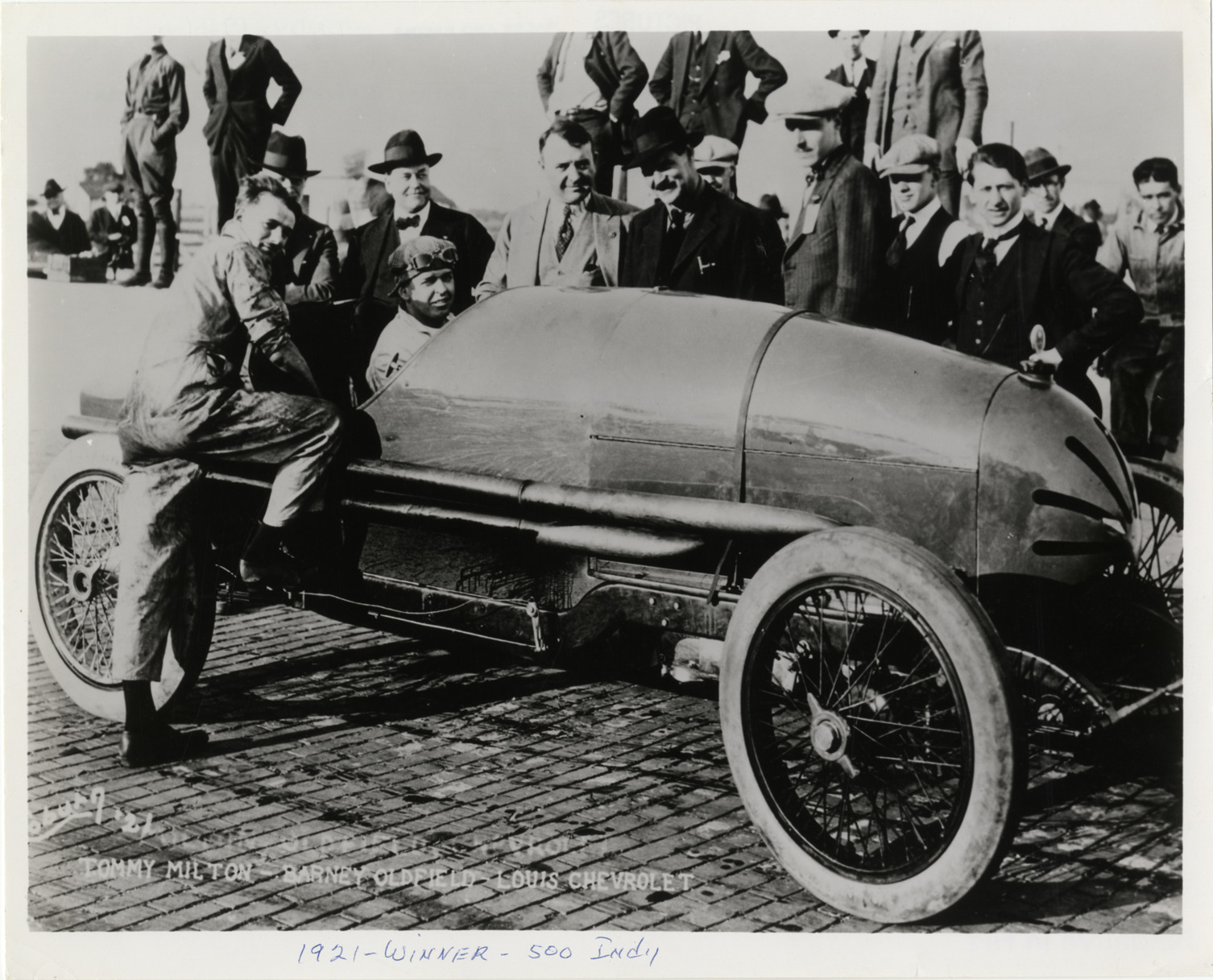 View of Tommy Milton posing in Frontenac car, surrounded by Barney Oldfield, Louis Chevrolet and onlookers, during the 1921 Indianapolis 500 races. Printed on front: "Tommy Milton, Barney Oldfield, Louis Chevrolet." Handwritten on front: "1921, winner, 500 Indy." Typed on back: "Frontenac car. Tommy Milton, Barney Oldfield, Louis Chevrolet." Handwritten on back: "Winner 1921, Tommy Milton, Frontenac car."